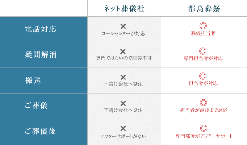 搬送のときと葬儀のときで担当するスタッフが違うことは、大きな葬儀社ではよくございます。都島葬祭はご家族に安心していただきたいからこそ一人のスタッフがご葬儀までお手伝いさせていただきます。