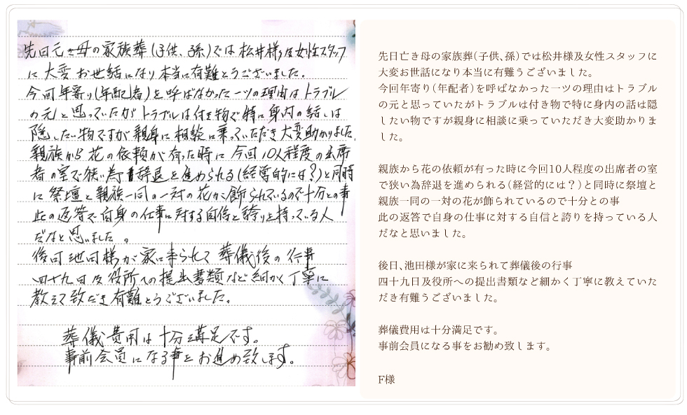 ご会葬の方々への感謝の気持ちとして、通り一遍な会葬状ではなく、ご遺族様の想いを綴った心温まる世界にひとつだけのオリジナル会葬礼状。ご希望により、ご用意させていただきます。